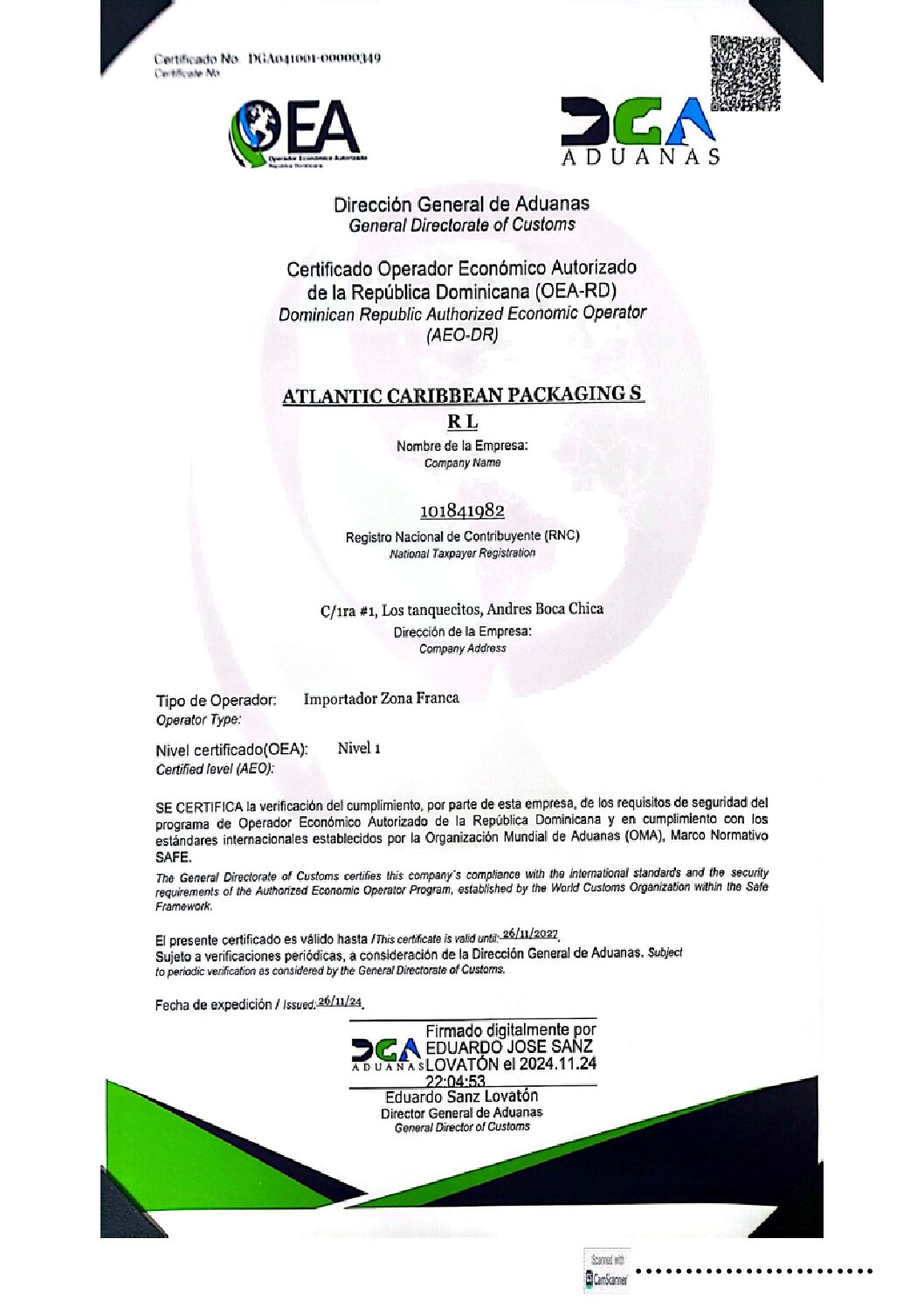 Recognition as an Authorized Economic Operator (OEA) Level 1, confirming compliance with customs security standards and best practices in international trade, supporting secure and efficient import and export operations.