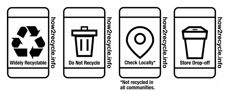 In an effort to help consumers decide how to properly dispose of these flexible materials and reduce confusion, How2Recycle released a “Store Drop-Off Label” to put on compatible flexible plastic packaging. In 2024, How2Recycle updated and improved its labeling system with new Pro labels, which include an updated version of the Store Drop-Off label. These refreshed icons are designed to make recycling instructions easier to follow and more consistent across products. Below are examples of the new H2R Pro labels.