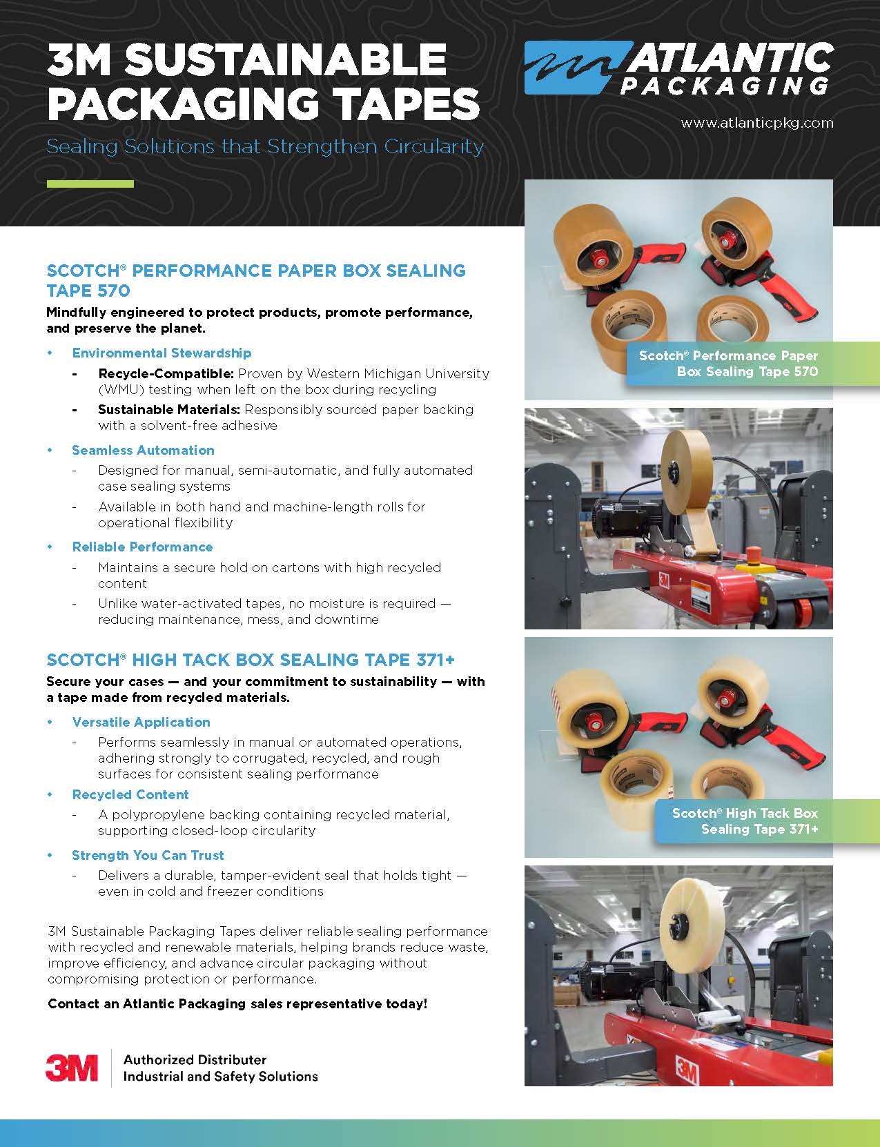 In this spirit, we’re excited to announce the addition of two new 3M sustainable packaging tapes to our portfolio: the Scotch® Performance Paper Box Sealing Tape 570 and the Scotch® High Tack Box Sealing Tape 371+. Both products are now available from Atlantic Packaging and A New Earth Project online in our New Earth Approved Catalog.